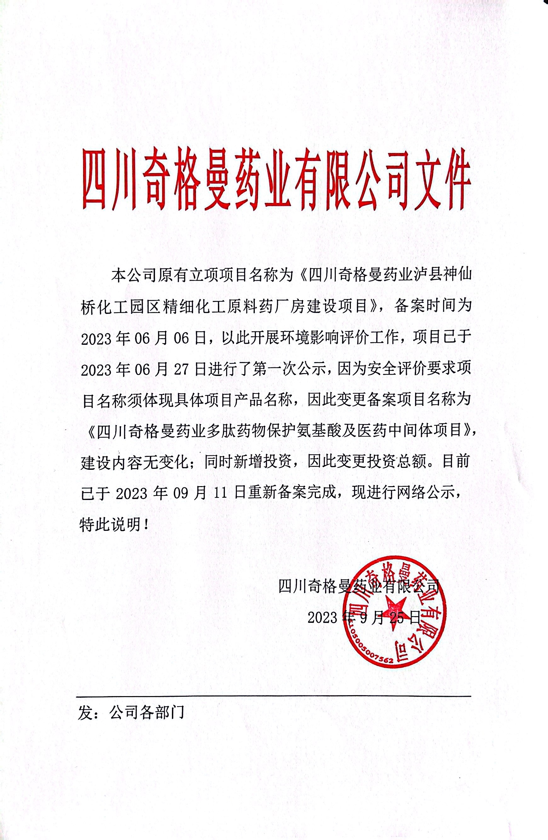 四川奇格曼藥業(yè)有限公司 四川奇格曼藥業(yè)多肽藥物保護(hù)氨基酸及醫(yī)藥中間體項(xiàng)目 環(huán)境影響評(píng)價(jià)公眾參與送審前公示